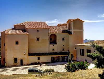 La fortificación de piedra se alza sobre el Puig de Sant Salvador, con gruesas murallas defensivas que rodean la iglesia de peregrinación de Sant Salvador.