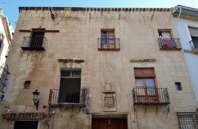 El palacio presenta muros de piedra, elementos arquitectónicos tradicionales y se erige como estructura destacada en el paisaje urbano de Alicante.