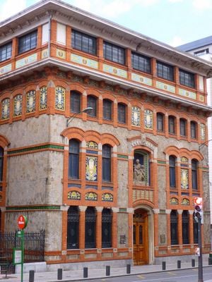 El edificio modernista presenta una fachada decorada que combina elementos neo-mudéjares con ladrillo, azulejos y piedra en la calle Urazurrutia.