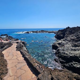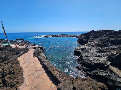 La combinación de arena negra, acantilados rojos y piscinas naturales crea distintas zonas de baño que cambian de aspecto con las mareas diarias.