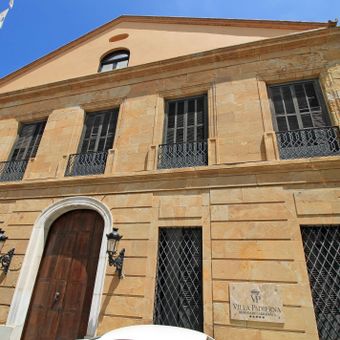 El Balneario de Carratraca presenta una fachada de arenisca roja dividida en tres cuerpos con una estructura central de dos pisos y alas laterales.