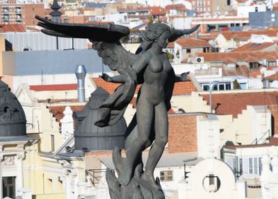 Federico Coullaut-Valera creó esta estatua en 1977 para reemplazar la escultura original de Ganímedes y el Fénix que adornaba el edificio desde 1911.