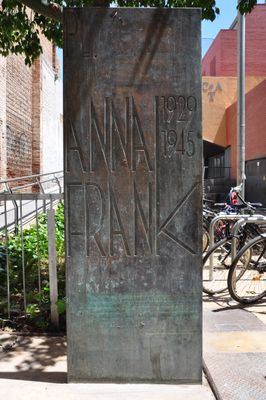 Un monolito de acero en la entrada de la plaza muestra un fragmento del diario de Ana Frank escrito antes de su captura.