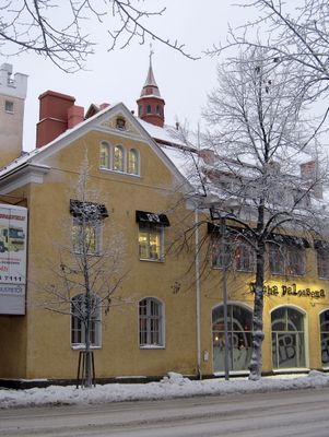 La Antigua Estación de Bomberos en Kauppurienkatu 24 presenta arquitectura Art Nouveau con elementos decorativos destacados en su fachada.