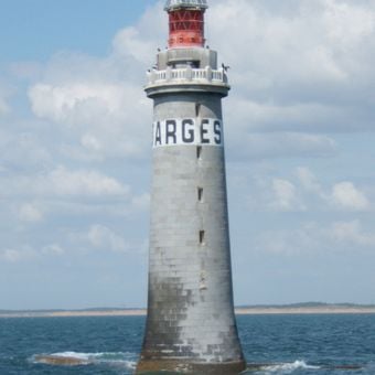 El Phare des Barges es una luz de navegación cerca de Les Sables-d'Olonne construida con granito azul de Avrillé en una meseta rocosa. Esta estructura marítima se erige en el mar abierto para guiar a los barcos.