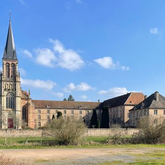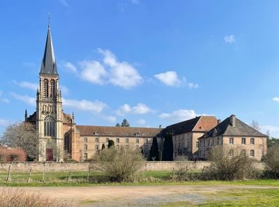 La Abadía Notre-Dame de Autrey presenta una arquitectura de arenisca rosa y alberga un parque de 4 hectáreas con jardines botánicos en el departamento de Vosges.