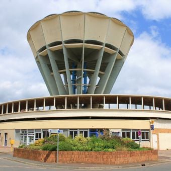 El depósito de agua presenta dieciséis vigas de hormigón que irradian desde un núcleo central, creando una estructura elíptica en el paisaje urbano.