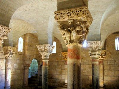 Los catorce capiteles de la cripta representan escenas bíblicas y alegóricas, reflejando las tradiciones artísticas románicas del suroeste de Francia.