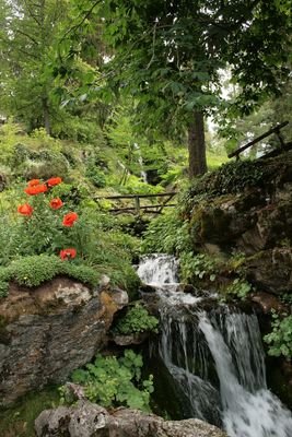 El jardín integra ruinas medievales, incluyendo un castillo del siglo XII y una capilla de 1687, entre su extensa colección de flora alpina y elementos acuáticos.
