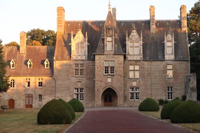 El Manoir de Brion se alza como una estructura de piedra cerca del pueblo de Genêts, con elementos arquitectónicos normandos y vistas a la bahía.