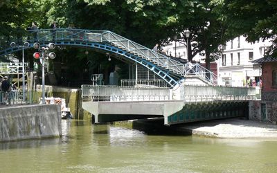 Construido en 1885, este puente giratorio representa un ejemplo de ingeniería hidráulica del siglo XIX en el sistema de canales parisino.