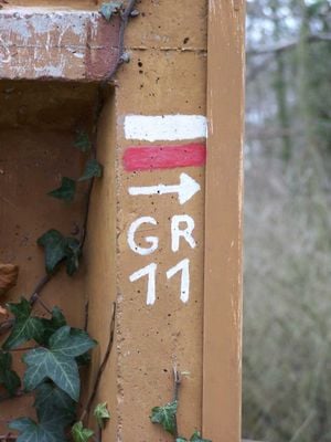 El GR 11 se extiende por los paisajes de la región de Île-de-France, señalizado con franjas blancas y rojas que guían a los excursionistas.