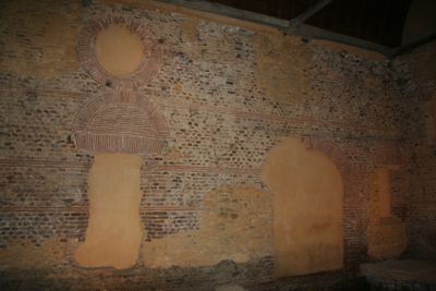 El complejo termal contiene cuatro salas de baño dispuestas linealmente, con muros romanos que alcanzan alturas de 8.50 metros y ventanas de ladrillo.
