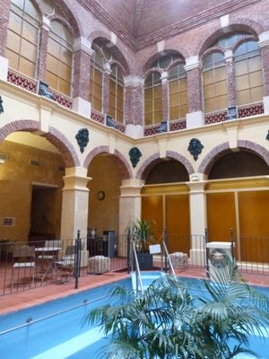 La arquitectura de las termas muestra elementos romanos y del siglo XIX, reflejando diferentes períodos de construcción y prácticas sociales.