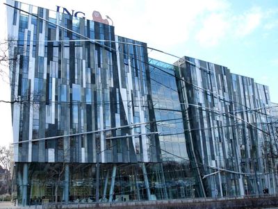 La sede central de ING comprende tres volúmenes interconectados con atrios acristalados, caracterizados por líneas de acero inoxidable que unen las secciones.