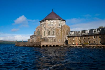 La Isla Station alberga estructuras religiosas que incluyen una basílica, estaciones de oración y dormitorios rodeados por las aguas de Lough Derg.