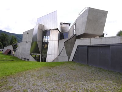 El edificio representa la arquitectura austriaca contemporánea mediante la integración de elementos naturales, formaciones rocosas y características acuáticas.