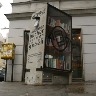 Public bookcase Wien, Bücherschrank Wien, Zieglergasse / Westbahnstraße im 7.Bezirk (Schrank, zementgebundene Holzspanplatten/Metall/Acrylglas)