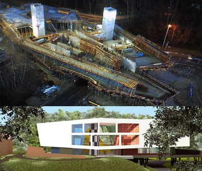 El edificio del museo semeja un barco anclado en el paisaje, con formas geométricas blancas y grandes ventanales que crean diferentes efectos de luz.