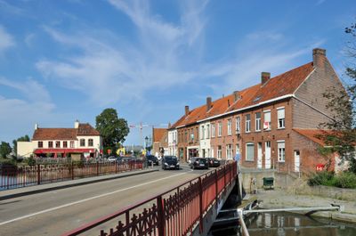 Dampoort presenta gruesos muros de piedra y un arco, incorporando tres puertas interconectadas: Speipoort, Sint-Niklaaspoort y Sint-Lenaartspoort en la plaza Sasplein.