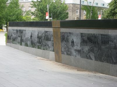El Memorial de Veteranos de Ontario presenta un muro de granito de 30 metros con imágenes grabadas con láser que muestran eventos militares.