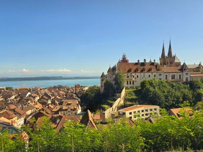 El Castillo de Neuchâtel es una fortaleza en una colina que domina la ciudad, con muros de piedra, torres y patios interiores que muestran arquitectura medieval y renacentista. Las estructuras forman un conjunto amplio que fue modificado y ampliado gradualmente a lo largo de siglos.