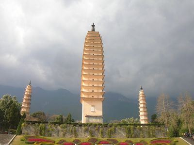 La pagoda principal Qianxun se construyó entre 823-840 DC durante el Reino Nanzhao, mientras que las dos pagodas menores se añadieron un siglo después.
