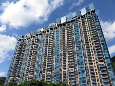 El rascacielos Aria se encuentra en las coordenadas 22.339129°N, 114.213587°E, con una fachada de vidrio que refleja la luz en el barrio.