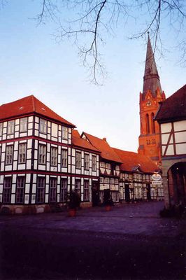 Nienburg se extiende a lo largo del río Weser entre Bremen y Hanover, presentando numerosos edificios de entramado de madera en su centro.