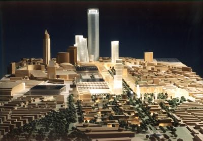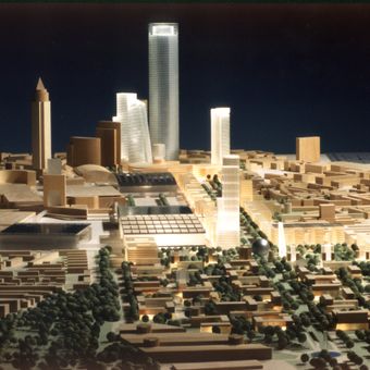 Los planes iniciales de 1998 por Albert Speer & Partner proponían una estructura de 369 metros dentro del plan maestro de Frankfurt.