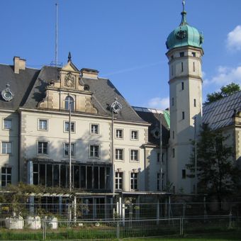 Jagdschloss Glienicke es una finca campestre de estilo Renacimiento Revival con fachadas simétricas, una torre central y grandes ventanales que dan al lago Wannsee. El edificio presenta características típicas de la arquitectura de revivalist con detalles decorativos que realzan su apariencia formal.
