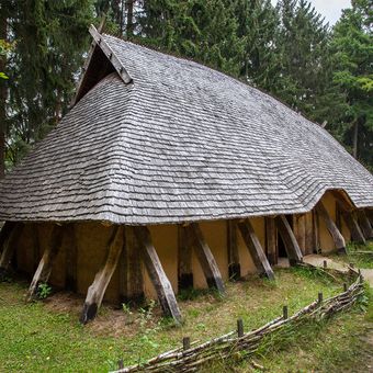 El museo exhibe seis grandes complejos de edificios que presentan la vida humana desde la Edad de Hielo hasta la Alta Edad Media.