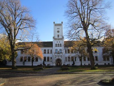 Los antiguos establos y el edificio del pequeño castillo funcionan como componentes de la Oficina Estatal de Beneficios y Pensiones de Baja Sajonia en Aurich.