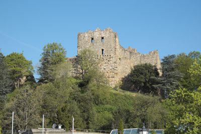 La fortaleza de piedra se alza sobre una colina dominando Badenweiler, con muros conservados, un salón principal con ventanas románicas y base de torre circular.