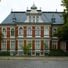 La Villa Oppenheim presenta paredes de ladrillo rojo con marcos de arenisca blanca, ventanas rectangulares en la planta baja y ventanas arqueadas con columnas.