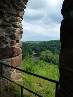 Las ruinas del castillo se elevan sobre un promontorio rocoso sobre el río Zschopau, con una estructura central de 22 por 15 metros y fosos protectores.