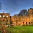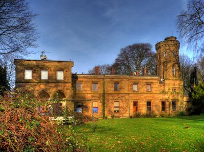 La villa de estilo gótico Tudor presenta elementos arquitectónicos que incluyen torres, ventanas ornamentadas y tallas en piedra en toda su estructura.