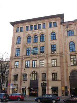 Maximilianstraße 34, des Eckhaus, über hohen Arkaden dreigeschossig, Kopfbau erhöht, Maximilianstil, von Friedrich Bürklein, 1861/62; Pendant zu Nr. 31 gegenüber und Block mit Nr. 32 und 36