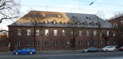 Bayerisches Kriegsarchiv, zweigeschossiger freistehender Rohbacksteinbau mit Walmdach, 1927/28; mit Einfriedung, um 1930; Nebengebäude, dreigeschossiger Rohbacksteinbau mit Satteldach, Kniestock und Lisenengliederung, um 1890