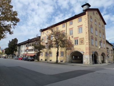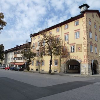 Wohn- und Geschäftshäuser, dreigeschossigen Flachsatteldachbauten im alpenländischen Heimatstil im Anschluss an das Rathaus, Teil einer nicht vollendeten Rathausplatz-Gestaltung von 1935; Fassadenbemalungen- und Stuckierungen teilsHeinrich Bickel (Erker, Nr. 2), teils von Osw