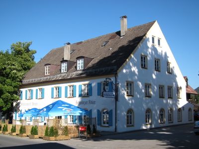 Gasthof Schwarzer Adler, zweigeschossiger traufständiger Satteldachbau mit Rundbogentor, zweites Viertel 19. Jahrhundert