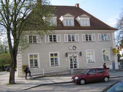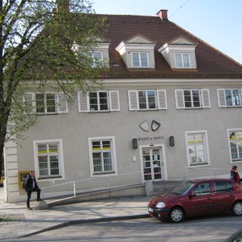 Postamt, Walmdachbau mit Putzgliederungen, 1924 von Robert Vorhoelzer und Franz Lochbrunner
