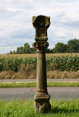 Marter, ionische Sandsteinsäule von 1714; Am Schaft mit eingemeißelter Gravur „1714 HANS HEROLD (?) MA:“, darüber Aufsatz mit rundbogigen Abschlussgesimsen und Engelsköpfen in den Lünette (Bildende Kunst). Ehemals waren im oberen Teil der Marter vie