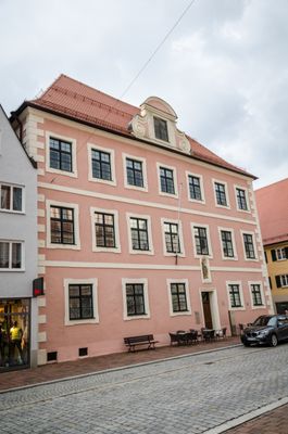 Königstraße 15, dreigeschossiger Bau aus zwei im rechten Winkel aneinanderstoßenden Flügeln mit abgewalmten Satteldächern, Zwerchgiebel mit Voluten, Fassadengestaltung mit Eckrustika, Putzbänder und geohrten Putzrahmen, für das Hochstift Augsburg wohl von Andre