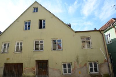 Äußere Einfahrt 3, mit Türgerüst, hölzernes Türgewände mit eingekerbtem Blütenornament, bezeichnet „1669“, Türblatt Mitte 18. Jahrhundert