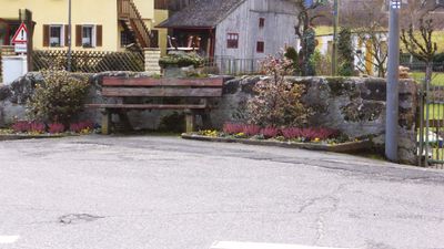 Sandsteinbrüstung einer Brücke, Mittelpfeiler bezeichnet mit „1700“