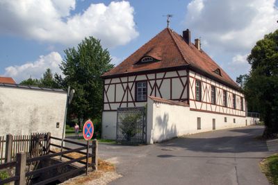 Fachwerkbau mit Walmdach, zweigeschossiger verputzter Fachwerkbau mit Walmdach und einfacher Fassadengliederung, bezeichnet mit „1724“