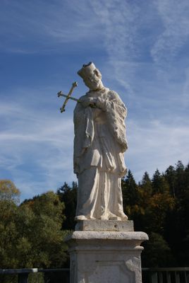 Figur des hl. Johannes Nepomuk, Figur auf gespiegeltem und profiliertem Sockel, Kalkstein, 18. Jahrhundert