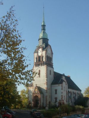 La Iglesia Paul-Gerhardt presenta una torre de 60 metros en su extremo oriental, combinando piedra pórfido roja de Rochlitz con superficies pintadas en tonos claros.