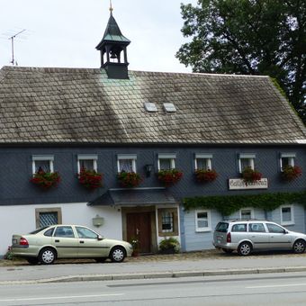 Gasthof „Petersbach“ Sohlander Straße 69, Obergeschoss Fachwerk verschiefert, baugeschichtlich und ortsgeschichtlich von Bedeutung, Umgebinde rechts 3/5/2 Joche, Erdgeschoss (neben Umgebinde) verputzt, Steinbank, Sandsteingewände, erstes Obergeschoss verschiefert, originale Fenstergrößen,